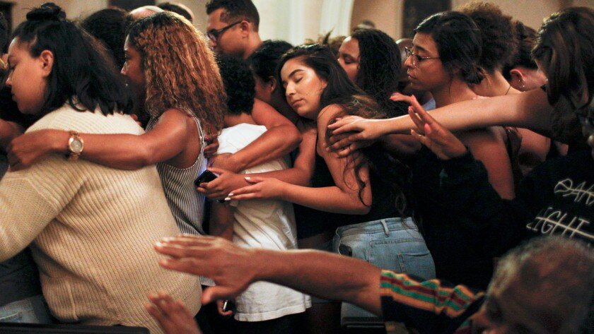 *head image from The McCarty Memorial Christian Church congregation comes together to embrace a man who recently lost his brother at the hands of police. (Harrison Hill / Los Angeles Times )